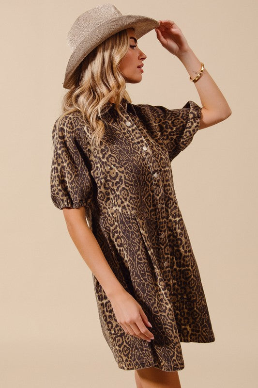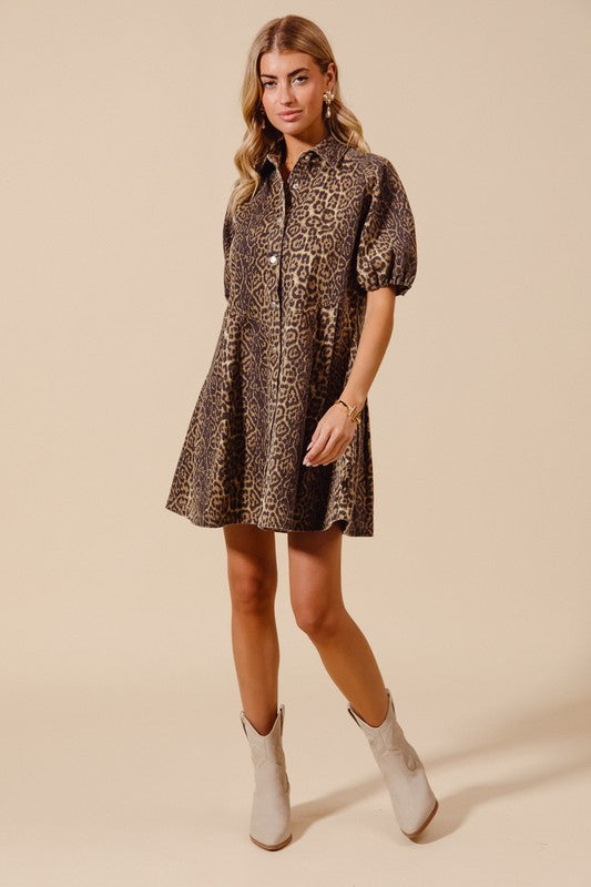 Unleash your wild side with our Leopard Denim Shirt Dress. Made from washed leopard denim and featuring a button-up design, this dress is perfect for a stylish look. Roar in fashion with this unique and versatile piece.
