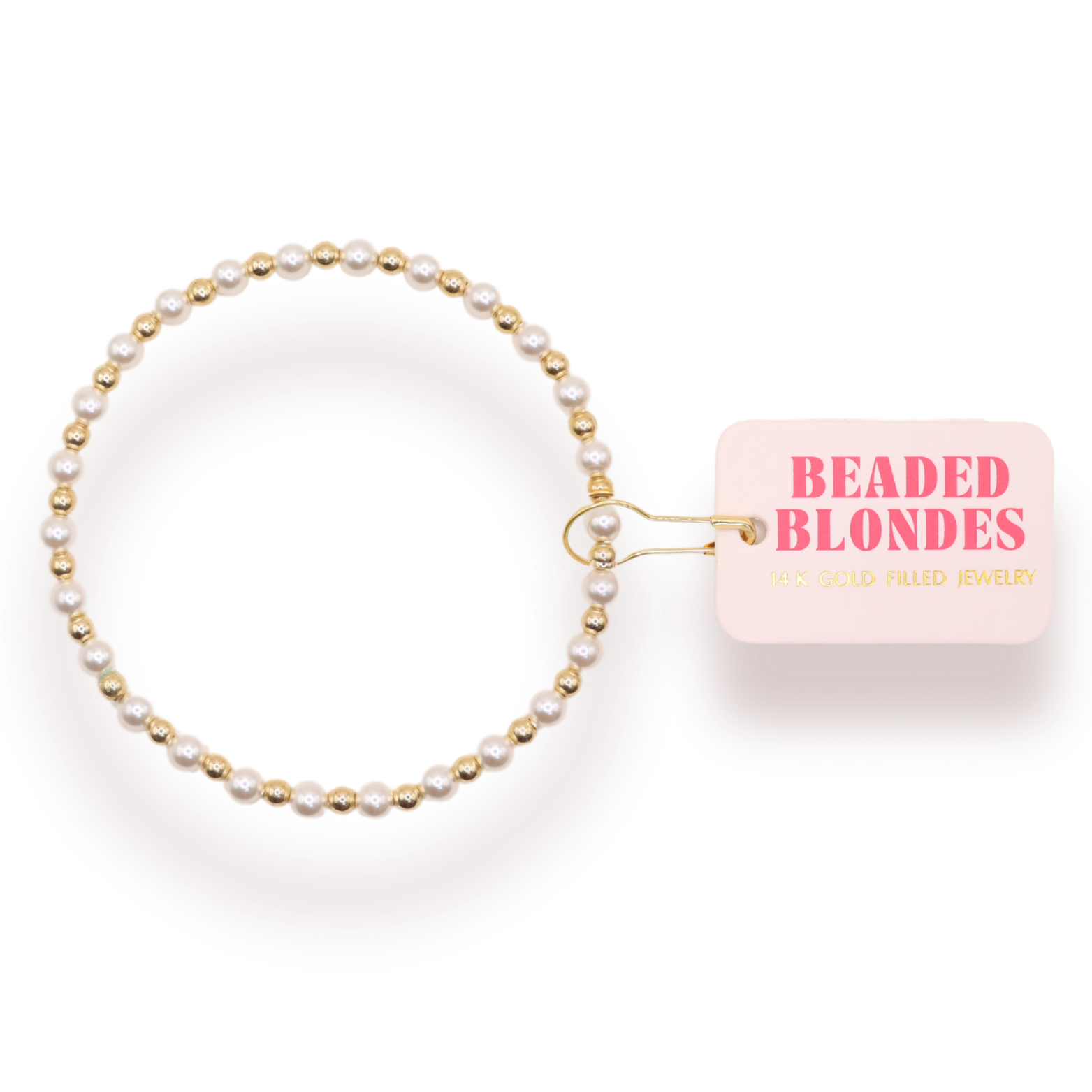 The Luci bracelet is 3mm beads + synthetic pearls. • 14 K gold filled & elastic string • Handstrung in College Station, Texas. Sourced in the US. • Waterproof, workout proof & tarnish proof • Care tips - harsh chemicals can cause slight darkening View our sizing guide Beaded Blondes offers styles with both freshwater and synthetic pearls—this design features synthetic pearls for a perfectly symmetrical, uniform look.